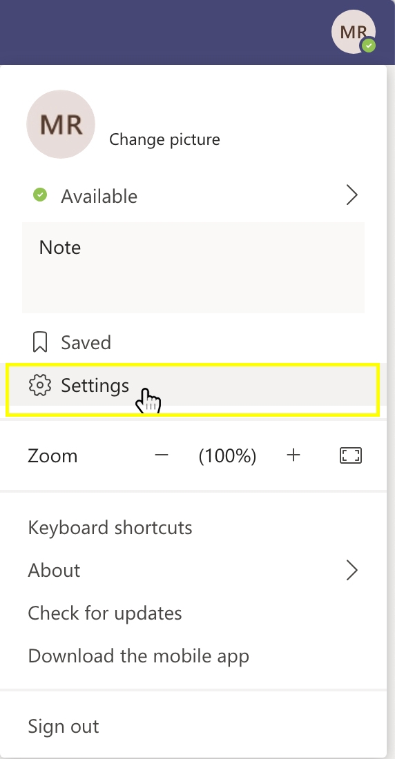 Click on your profile picture within the Teams application. From the dropdown, choose Settings.